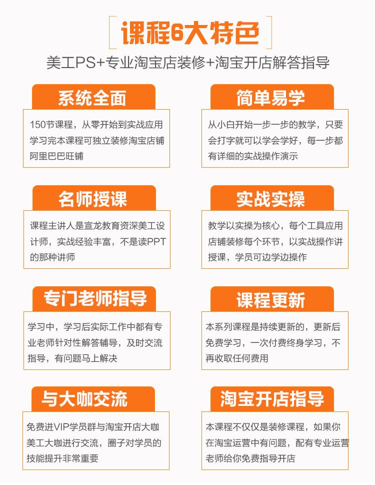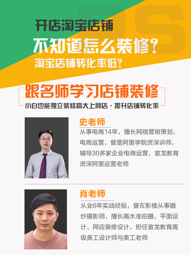 从零开始到精通美工设计,适合小白或者有一定经验者学习,课程通俗易懂,系统全面,每个知识点讲解详细具体,实战案例演示,真正做到学了就可以用。 课程由宣龙教育资深美工老师肖老师主讲,讲师从业经验6年以上,对摄影,美工设计有深厚的功底。 学习模式:视频教学+课后作业+学员相互交流,学会本课程可以独立设计淘宝店铺,阿里巴巴店铺,京东店铺等,可以从事美工职业。